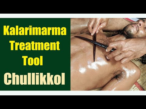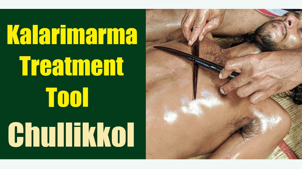 The massage therapy using Chullikkol is helpful to open up the sweat pores of the layers of skin and also to re correct the joint nerves which are formed due to tumors along with the proper blood circulation. This tool is also useful for confirming the thickness of bones, controlling the elasticity of muscles and also to beautify the physical shape of the body. It is also helpful to regulate the speed of Marmas and also for assessing the equilibrium of mass related to joints. Treatments using Chullikkol is helpful to completely remove the pain related to heals and to also remove swellings found in muscle layers. The purpose of this video is to preserve this precious knowledge from extinction.