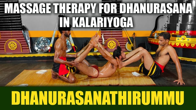 Dhanurasanathirummu of kalariyoga massage is helpful to reduce the excess mass of kalariyoga students, to improve the efficiency of chest and back layers and to improve functional level of vertibrae of backbone and related muscles and nerves. Dhanurasana is one of the very effective asana to maintain the equilibrium from head to toe. Dhanurasanathirummu is provided for a few students of kalari, who may not have enough flexibility to perform dhanurasana. It may be around 2 out of 10 kalariyoga students who needs kalariyoga massage therapy. The massage routes of dhanurasana are demonstrated in the full version video of approximate duration of 40 minutes. The purpose of this video is to preserve this precious knowledge from extinction.