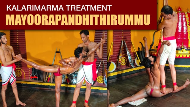 Mayoorapandhithirummu is helpful to perfectly maintain the equilibrium of front and back side of the body of a senior kalaripayattu student and is helpful for preventing stagnations of joints and nerves. It is also helpful to maintain and improve beauty and strength of shareera-angavadivukal or body alignment and postures and nourishes sourabhyavadivu and also to maintain balance and easiness while performing various postures and associated movements described in kalaripayattu. As a result of reduced stagnations in air passage routes and strong joints chances to have a wide catagory of diseases is neutralised and also reduces palpitations while performing even hard physical activities. The perfection of performing Mayooravadivu and associated movements is very important for a practitioner while performing angathari of kalaripayattu. But the people who had mild experience in angathari and started to train students may not even heard about mayoorapanthithirummu. This therapy is mostly provided for dedicated students who have practiced 6 payatukal of every weapons of angathari which may normally needs 12 years of systametic practice of kalaripayattu. This therapy segment is very helpful for such practitioners to remember and to maintain perfection in performance of each modules of kalaripayattu. Mayooravadivu is known as the backbone of ashtavadivukal of kalaripayattu which can be nourished to its perfection using mayoorapandhithirummu. The purpose of this video is to preserve this precious knowledge from extinction.