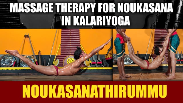 Noukasanathirummu is helpful to perfectly perform noukasana and associated postures while practicing kalariyoga by kalaripayattu students. The palm massage routes insisted in this massage therapy are based on the principles of kalari marma therapy. This massage therapy is provided for those in a kalari who don't have enough body capability to perfectly perform noukasana. The regular practice of Noukasana is helpful to improve body capabilities such as to swim for longer duration, to walk more distance, to pass through higher peaks, to climb up and hang on climbers for longer duration etc. It is also helpful for the proper coordination of joints, to improve the body balance, to minimise palpitation, to improve the performance of internal organs and to enhance blood circulation and air passage routes through various organs especially through hands and legs which results in reduced pain and prickling sensation. The massage routes are perfectly demonstrated in the full version video of approximate duration of 45 minutes. The purpose of this video is to preserve this precious knowledge from extinction.