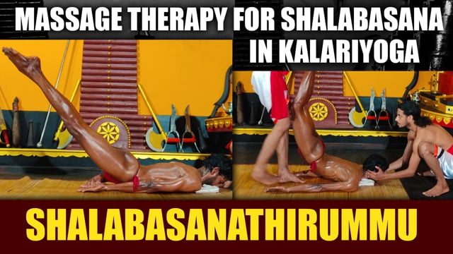 Shalabhasana is one among the asanas of kalariyoga which is used to be practiced in traditional kalaries. Its practice is helpful to improve the strength of heart muscles, to maintain the equilibrium of various nerves of heart, to maintain the air transferring capacity of lungs, to maintain well the posture of backbone especially mooladhara and also to reduce the chances to have diseases related to the lower abdominal organs. Shalabhasanathirummu is used to be provided for those students who have any sort of difficulty to perfectly perform shalabhasana. The course duration may be 24 days, 36 days or 41 days which depends upon the body condition of the person who are subjected to this therapy. The massage routes and methodology may also vary according to the defects reflected in the subjected person such as dhrishttidhosha, moolikadhosha, vaathadhosha, sandhidhosha and peshidhosha. The person can easily perform shalabhasana to its perfection within a very short duration just after completing the therapy course along with regular practice. The master suggest kalari yoga asanas from the list of more than 1,200 asanas for each and every student depends upon their body condition which will be helpful to attain a better phychic level to overcome negative qualities and to develop better defencive mechanism against diseases. The massage routes are perfectly demonstrated in the full version video of approximate duration of 40 minutes. The purpose of this video is to preserve this precious knowledge from extinction.