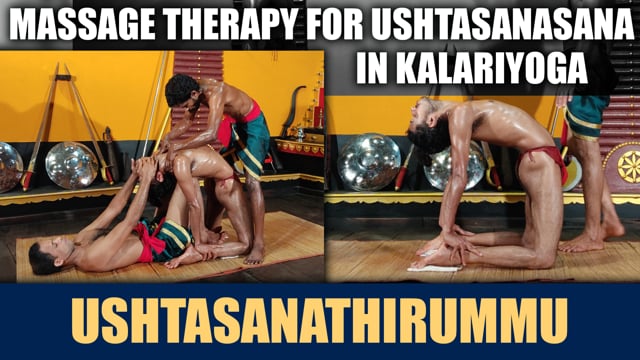 Ushtasana is one among the primary asanas of kalariyoga which is used to be practiced in traditional kalaris. The practice of Ushtasana is helpful to overcome health issues like asthma and to overcome heart, lungs, stomach and liver related diseases. It is also helpful to reduce the excessive pressure levels related to head. Ushtasanathirummu is provided for a practitioner only if he has any sort of difficulties or issues while performing ushtasana. The massage therapy course duration may be 24 days, 36 days or 41 days which depends upon the body condition who are subjected to this therapy. This therapy is included with the perfect blending of palm massage routes and leg massage routes of kalari marma therapy. It is important to maintain pathya and routine by the practitioner for attaining maximum results while he is subjected to this therapy. The regular practice of kalari yoga asanas will be helpful for a person to recover from various diseases and also to lead a healthy life. The massage routes utilised in ushtasanathirummu are perfectly demonstrated in the full version video of approximate duration of 40 minutes. The purpose of this video is to preserve this precious knowledge from extinction.